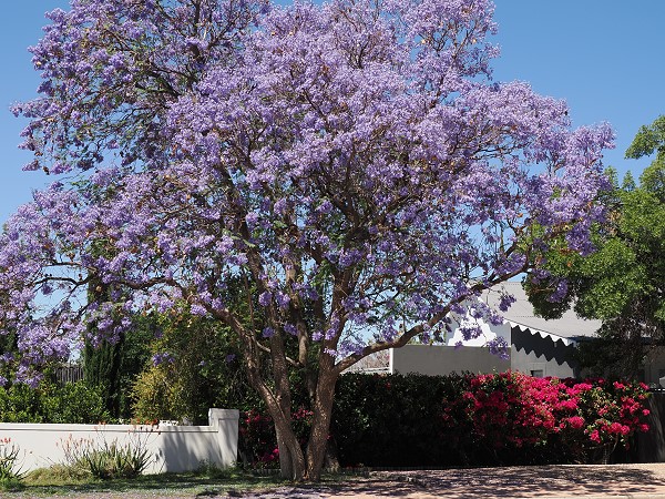 Obwohl sie heute charakteristisch für viele südafrikanische Städte sind, besonders Pretoria schmückt sich mit blühenden Aleen, stammen Jacarandas ursprünglich aus Südamerika. In Prince Albert harmonieren sie besonders schön mit den weißen Fassaden der historischen Häuser.