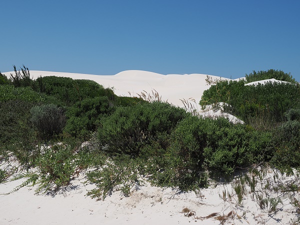 Der Sand der Dünen ist gleißend weiß hier. Der Strandabschnitt ist lang, windoffen und weitgehend unberührt. Auf vielen Flächen war der Sand bis auf den kiesigen Untergrund weggepustet. Keine Promenade, kein Lärm, keine Bausünden im Hintergrund. Nur die teilweise bewachsenen Dünen, das Meer und der Himmel. Im Vergleich zu Agulhas und Struisbaai wirkt "Die Plaat" fast zeitlos und ist der perfekte Gegenpol zur touristischen Entwicklung der Region. In den Dünen fanden wir blühende Pflanzen, die von unzähligen Schmetterlingen besucht wurden.