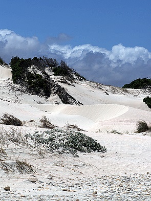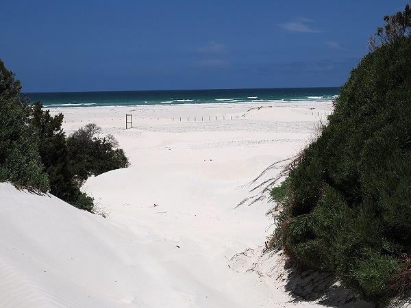 Besonders eindrücklich ist der Strand "Die Plaat". Wir wollten hierher einen kurzen Abstecher machen, kamen aber trotz Allrad nicht ganz bis ans Ende, weil meterhoch feinster Sand auf der Zuwegung Hügel und Dünen bildete. Da niemand sonst hier war, haben wir das Auto am Wegrand stehen gelassen und sind zu Fuß in Richtung Strand gegangen.