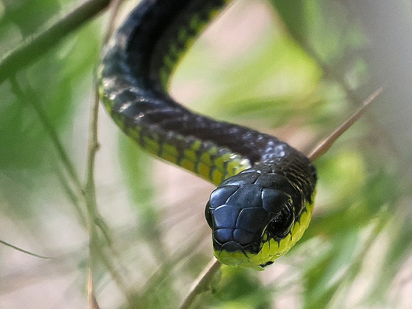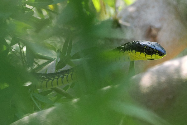 Sie kann bis zu 1,6 Meter lang werden, mit Tele mussten wir aber nicht zu nah ran. Eine Boomslang ist zwar extrem flink, aber auch scheu und sie wird niemals von sich aus angreifen. Bemerkt sie, dass sich Menschen in ihrer Umgebung befinden, weicht sie aus und versteckt sich, so gut es geht. Es handelt sich um eine Giftschlange, deren Biss für Menschen durchaus tödlich sein kann.