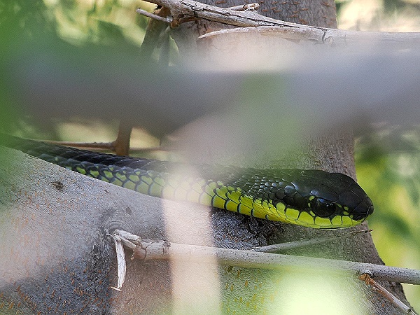Laut unserem Vermieter gab es in den letzten Jahren erst einmal eine Sichtung von einem Weibchen. Hier hatten wir ein männliches Exemplar. Er war leuchtend grün bis fast neongelb, wobei die Schuppen schwarz umrandet sind, was ein wunderschönes Netzmuster ergibt. Leider sahen wir das nur im Schatten. Das auffälligste Merkmal sind die riesigen, grünen Augen. Eine Boomslang hat im Verhältnis zum Kopf die größten Augen aller afrikanischen Schlangen und sie sieht dich also sehr genau.