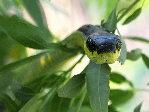 Plötzlich fingen die kleinen Vögel an zu schimpfen und zu zetern und hörten gar nicht mehr auf. Im dichten Busch an der Terrasse waren viele Blätter, aber die kleinen Vögel flogen immer wieder schimpfend dahin. Die Ursache haben wir schnell erspäht: eine Schlange lag dort. Als sie uns sah, bewegte sie sich schnell innerhalb vom Busch an eine andere Stelle.