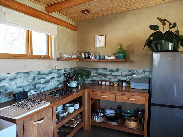Das Haus ist handgefertigt mit lokalen Naturmaterialien wie Holz, Lehm und Stroh, was für eine warme, organische Atmosphäre sorgt. Die offene Küche ist hübsch, es gibt einen Esstisch und gemütliche Sofas. Die großen Schiebetüren vor Wohn- und Schlafzimmer können leicht geöffnet werden und bieten einen schönen Weitblick in die Umgebung auf die Walker Bay und die Kleinriviersberge. Eine solche hochwertige Qualität an Schiebetüren wie hier hatten wir bislang in Südafrika noch nicht gesehen.