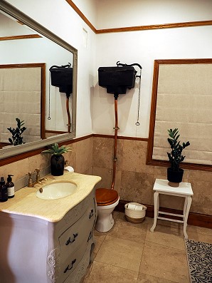 Das Gebäude ist etwa 110 Jahre alt. Die Einrichtung, die Lichtschalter, Beschläge und Möbel sind authentisch im Stil des ursprünglichen Hauses gehalten, wurden aber von den Besitzern mit modernen Elementen kombiniert. Man fährt durch ein eher nur dekoratives Gartentor auf den hauseigenen Parkplatz, von hier führt eine Tür direkt in die Küche. Das ist praktisch zum Ausladen. Der CheckIn erfolgte über einen Schlüsselkasten und die Besitzer waren jederzeit per WhatsApp erreichbar. Zum Haus gehört auch Personal, das am Morgen kommt, ein Gärtner und eine Hausangestellte. Sie arbeiten in der Garage und betraten das Haus erst, wenn man es verlassen hat.