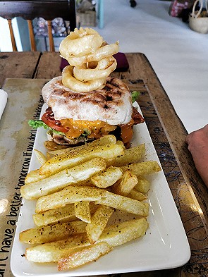 Statt pochierte Eier Benedict mit Lachs auf Rösti wie bestellt brachte die Kellnerin uns leider Rührei mit Lachs auf Croissant. Wir haben es dann trotzdem gegessen, war auch lecker. Dazu tranken wir guten Cappuchino, einen Beetroot-Ginger Saft und ein Glas Kaffee-Milchshake.