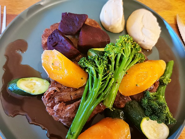Am Abend waren wir dann nebenan mit Ute und Peer im Hello You verbredet. Dort bekamen wir einen Tisch im Innenraum und bestellten erst einmal eine Flasche Wasser. Für eine Vorspeise hatten wir an diesem Abend nicht genug Hunger, daher gleich die Hauptspeisen. Michael bestellte sich Springbock-Rump mit Gemüse, Rösti und Mash. Ich hatte geschmorten Lammhals mit Gemüse und runde Mini Kroketten, die hier als Gnocci verkauft wurden und Mash.