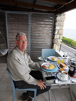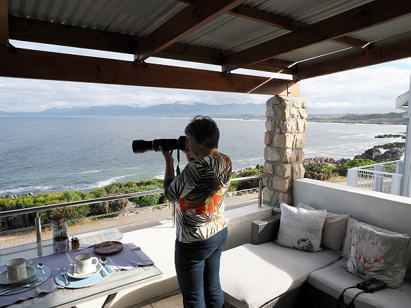 Unsere erste Unterkunft 2025 war auch die einzige mit Frühstück in 8 Wochen. In der Abtrennung der Terrasse befindet sich eine Tür und man kann am Vorabend auswählen, was man zum Frühstück haben möchte und wann. Pünktlich zur bestellten Uhrzeit wird dann geliefert und wir konnten unser Frühstück in Ruhe und privat genießen, dabei die Wale fotografieren, die ganz nahe hochsprangen und Fluke zeigten. Am zweiten Tag gab es heftigere Wellen und die Bedingungen waren nicht ganz so gut.
