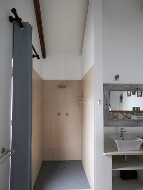 Das Zimmer ist 45 qm groß und offen gestaltet, hinter der Abtrennung am Kopfende des Kingsize Betts steht eine Badewanne und auch die Waschbecken und die Dusche sind offen. Nur die Toilette hat eine Tür und liegt um die Ecke. Alle drei Fenstzter und auch die Fronscheibe zur Terrasse hin lassen sich mit Vorhängen verdunkeln.