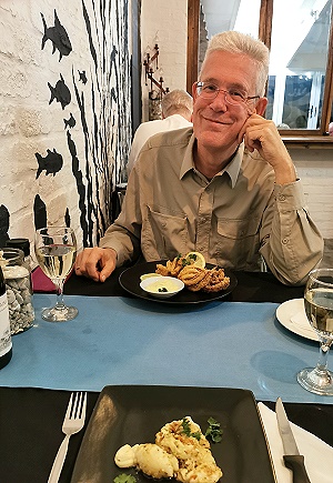Das Lokal ist einfach, aber nett eingerichtet mit Meeresmotiven an den Wänden und hat ca. 36 Plätze, eine halboffene Küche und es roch sehr lecker. Michael bestellt als Vorspeise frittierte Cajun Tenticles vom Octopus, ich hatte mich für Filled Octopus Tubes mit Frischkäse und Knoblauch entschieden. Nachdem wir eine Weile gewartet hatten, kam der Kellner und entschuldigte sich. Unsere Bestellung war verloren gegangen. Kann ja mal passieren, so bekamen wir dann recht schnell die Vorspeise.