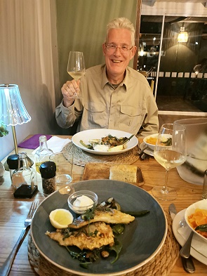 Schon im Vorfeld hatten wir den ersten Abend im Restaurant JT´s Kitchen reserviert. Es hat keine Alkohol-Lizenz und ist BYO, so machten wir uns mit einer Flasche Weißwein auf den 20 minütigen Fußweg in Richtung Gansbaaii. Hier gibt es hauptsächlich Fischgerichte und deshalb waren wir gekommen, das Lokal war ausgebucht und es wurden Leute ohne Reservierung auch weggeschickt.