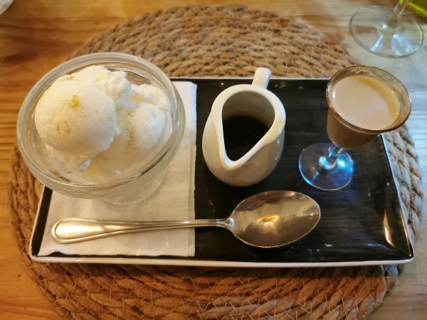 Dafür war die Hauptspeise lecker, wir hatten beide Hake Filet mit leckeren Kartoffelstampf und Gemüse, dazu Aioli in einer kleinen Schüssel. Auch bei Nachtisch weren wir uns diesmal einig: Afogato mit Amarula, das in drei Komponenten einzelnen serviert wurde: Eis, Espresso und Amarula.