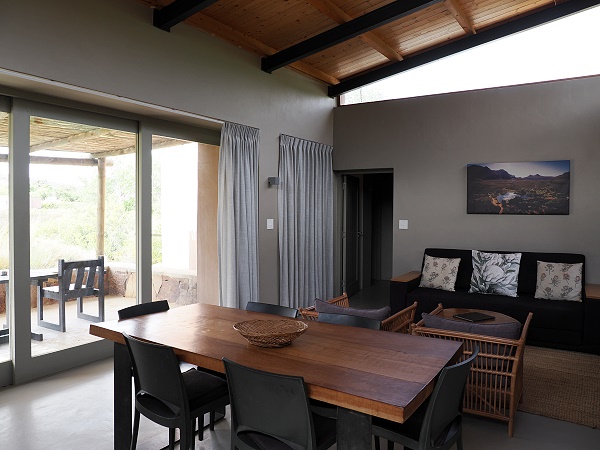 Es gibt einen Innen- und Außen-Braai sowie einen Kamin für kühlere Winterabende. Dazu gemütliche Sofas und eine große überdachte Terrasse mit Schiebetür. Nur die zwei schweren Stühle draußen fanden wir etwas unbequem, aber Kissen waren vorhanden. Einen Fernseher sucht man hier vergeblich – man wohnt hier wegen Ruhe und Naturerlebnis.