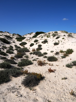 Vor einigen Jahren sind wir schon mal am Rocherpan Nature Reserve vorbei gefahren, diesmal wollten wir unbedingt dort wohnen. Leider hatten wir uns dazu nicht die ideale Reisezeit ausgesucht, aber im Südwinter halten wir uns nicht in Südafrika auf. Das Namensgebende Vlei mit seinem reichen Vogelleben war im Oktober nicht mehr mit Wasser gefüllt, dazu muss man ziemlich früh um Juli/August vor Ort sein, wenn der Papkuils-Fluss nach Regenfällen in Piketberg Wasser führt.