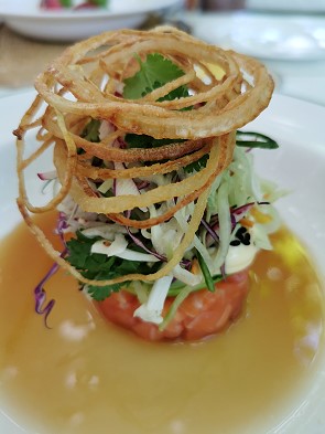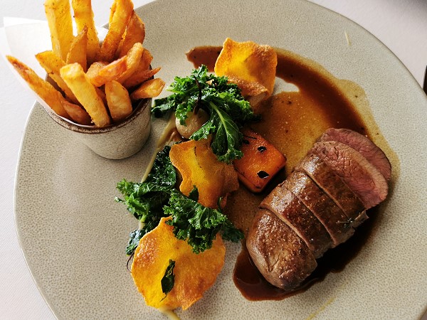 Wir begannen mit Vorspeisen: Beeftartar mit Chips für Michael und ein tolles Springbockloin mit Butternutpurré für mich.