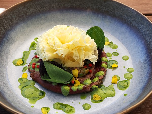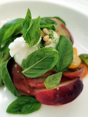 Begonnen haben wir das Menü natürlich mit dem hervorragenden rosa Sekt. Dann bestellten wir eine wunderbare frische Burrata mit Aprikosen und Basilikum für mich und Michael schmeckte ein Tartare aus Lachsforelle.