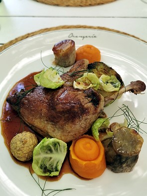 Dann Gemsbok Loin mit Orange und ein Duck Confit Leg mit Beilagen. Beides sehr lecker und genau unser Geschmack. Dazu passte der ausgesuchte Quevri Wein, den wir aber nicht austranken, sondern noch halb gefüllt mitnahmen.