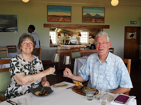 Da Sonntag war und wir keine Flasche Wein kaufen konnten bestellten wir dazu je eine Flasche Weltevrede Chardonnay und den fantastischen Bedrock Shiraz. Die namen wir dann mit in die nächste Unterkunft zum Abendessen. Zusammen mit Wasser und zwei Cappuchino kostet uns das 1.800 Rand.