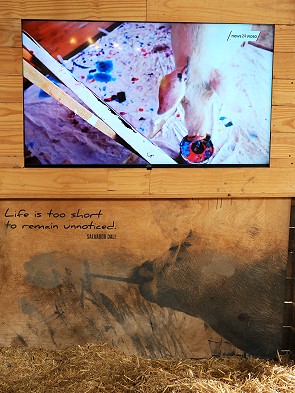 Überall im Showroom laufen Videopräsentationen und stehen große Tafeln, die das malende Schwein zeigen und die Kunstwerke werden in der hauseigenen OINK Gallery ausgestellt. Das Tier ist leider 2023 verstorben.