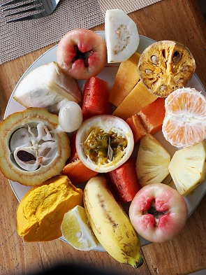 Wassermelone, Ananas, Papaya und Mango gehören zum Standardprogramm und sind Bestandteil von jedem Frühstück, gerne auch als Saft serviert. In einer Unterkunft bekamen wir auch Obstsorten wie Holzapfel, frischen Kakao, Rambutan und Canistel (Eidotter-Frucht), die wir aber so gar nicht mochten.
