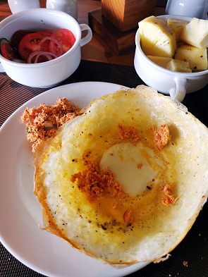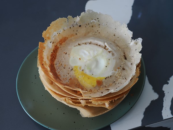 Ein Morgen in Sri Lanka beginnt idealerweise mit Egg Hoppers. Ais einer schüsselförmigen Pfanne kommen die Hoppers, hauchdünne Pfannkuchen aus fermentiertem Reismehl und Kokosmilch. Dazu wird scharfes serviert. Stockt in der Mitte noch ein aufgeschlagenes Ei, dann sind das Egg Hoppers. Die Ränder sind knusprig wie Glas, der Boden weich und fluffig. Besonders lecker, aber leider nicht in allen Unterkünften zu bekommen, weil sie ganz frisch aus der Küche serviert werden müssen.