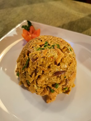 Das srilankische Biryani unterscheidet sich deutlich vom indischen Original. Es ist oft schwerer, würziger und kompakter. Das Wichtigste ist die Beilage: meist eine ordentliche Portion Devilled Chicken (ein scharf-süßliches Huhn) und eine Schale mit feuriger Chilipaste.