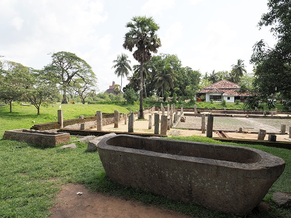 Wir liefen das Stück zu Fuß, vorbei an Languren im Park und der antiken Mahapali Alms Hall. Dieses Gebäude diente über Jahrhunderte als zentrale Speisehalle für die tausenden Mönche, die in den umliegenden Klöstern lebten. Es wurde ursprünglich von König Devanampiya Tissa im 3. Jahrhundert v. Chr. errichtet und später von verschiedenen Königen, insbesondere von Mahinda II., erweitert. Das beeindruckendste Merkmal dieser Anlage ist der 8 Meter lange, aus Stein gehauene Trog, der oft als "Rice Boat" bezeichnet wird, unten auf dem ersten Bild zu sehen. Archäologen haben berechnet, dass allein dieses eine Trog-Boot genug Reis fasste, um etwa 3.000 Mönche gleichzeitig zu versorgen.