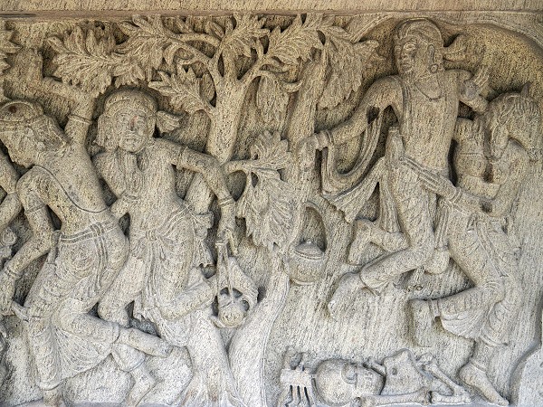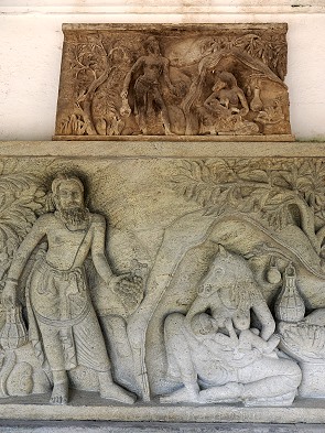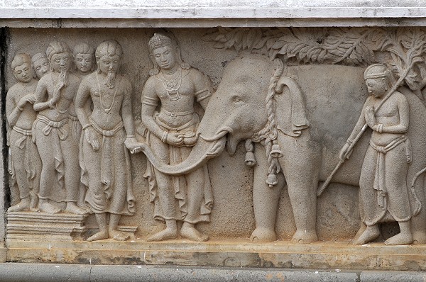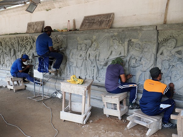 Wir konnten am Rand der Anlage noch einigen Steinmetzen bei der Arbeit zuschauen, die mit Präzision und Geschick dekorative Platten für die Verziehrung der umlaufenden Mauer der Terrasse fertigen, in erstaunlicher Größe und sehr dreidimensional ausgeführt. Ein Bauwerk dieser Größe ist ein Generationenprojekt. An den vier Haupthimmelsrichtungen einer Stupa stehen traditionell die Wahalkadas. Das sind monumentale Vorbauten oder Schaufronten. Die Steinmetze fertigen hierfür hochkomplexe Reliefs an. Häufig werden Elefanten, Löwen, Pferde und Stiere sowie florale Rankenmuster eingearbeitet.