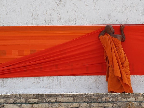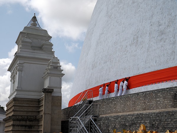 Das Herzstück der Kapruka Pooja ist das Umwickeln der riesigen, glockenförmigen Kuppel der Stupa mit langen Bahnen aus safrangelbem oder orangefarbenem Stoff. Diese Stoffbahnen können mehrere hundert Meter lang sein.