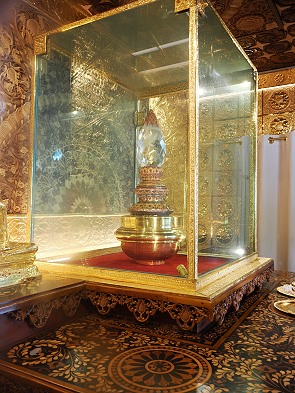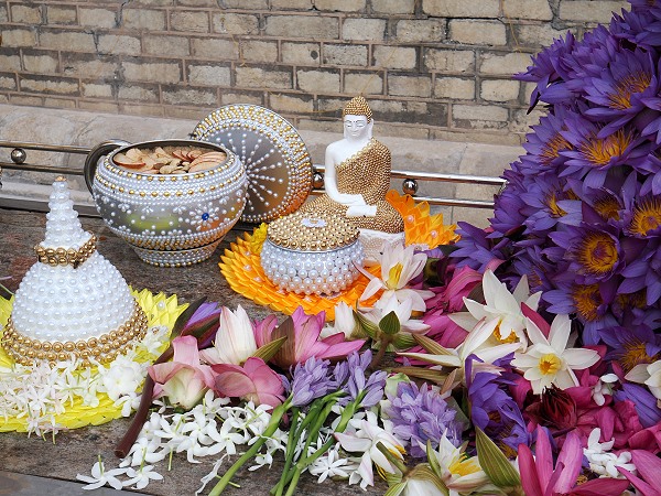 Im Gegensatz zum schlichten Weiß der äußeren Stupa ist das Innere hier in kräftigen Farben bemalt. Auch die Statuen sind meist kunstvoll bemalt, was ihnen eine lebendige Präsenz verleiht. Die Flächen vor den Statuen sind meist überhäuft mit duftenden Lotosblüten, Jasmin und Frangipani. Der Duft ist hier deutlich intensiver als im Freien.