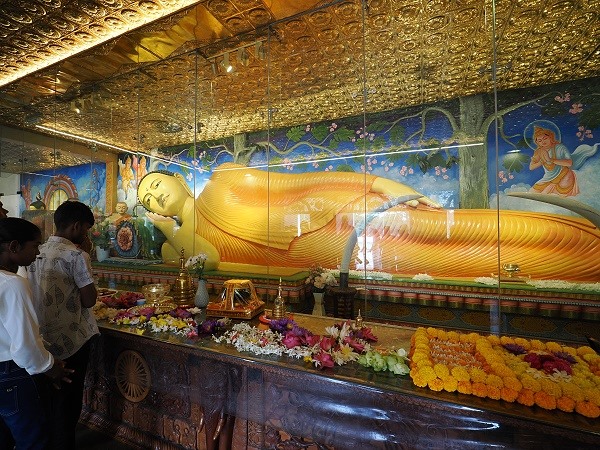 Während die Stupa selbst durch ihre Größe beeindruckt, bietet das Innere des Bildhauses davor einen ruhigen Kontrast. Der liegende Buddha stellt den Moment des Parinirvana dar, den endgültigen Heimgang des Buddha und den Austritt aus dem Kreislauf der Wiedergeburten. Er liegt auf seiner rechten Seite, den Kopf auf die rechte Hand gestützt.