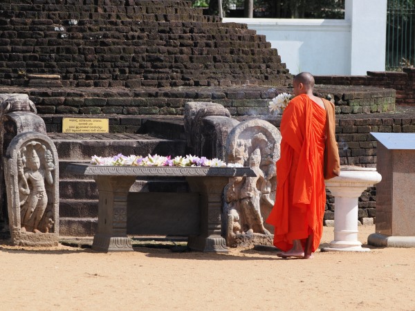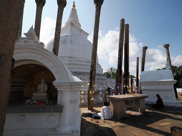 Die Thuparamaya ist nicht nur architektonisch faszinierend, sondern auch tief in der Gründungsgeschichte des Buddhismus auf Sri Lanka verwurzelt. Gläubige in weißer Kleidung umrunden das Heiligtum im Uhrzeigersinn, zünden Öllampen an oder legen duftende Jasminblüten und schöne Seerosen auf den Altären nieder.