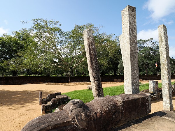 Unser erster kurzer Stopp erfolgte an den Überresten des königlichen Palastes. Die Ruinen des Royal Palace, die heute vor allem durch die noch stehenden massiven Grundmauern und kunstvoll gearbeiteten Steinstufen beeindrucken, lassen die einstige Pracht der Residenz von König Parakramabahu I. erahnen. Besonders bemerkenswert sind die gut erhaltenen Wächtersteine und die feinen Steinmetzarbeiten an den Treppenaufgängen, die den Eingangsbereich säumen.