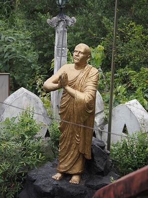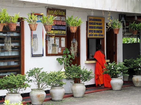 Beim Betreten des Tempelgeländes ist wie überall anders auch üblich, die Schuhe am Eingang zu lassen, was den direkten Kontakt zum kühlen Boden ermöglicht, während man sich dem Fundament der Statue nähert. Oben wurden wir gleich von einem Mann abgepasst, der uns Baumwollbändchen umband und dabei einige Sprüche murmelte. Dem konnten wir uns kaum entziehen, natürlich wurde am Ende eine Spende erwartet. Aber die geben wir sowieso, wenn wir Tempel besuchen die keinen Eintritt kosten. Hier ist man geschäftstüchtig: Pro Person kostet es 300 LKR, für den Segen gibt es eine Spende, und der Mann am Schuh-Kiosk vor dem Eingang hätte auch gerne einen Obulus.