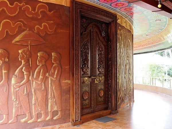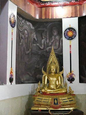 Auf einer der unteren Ebenen des Treppenturms gibt es auch einen Zugang zum Inneren der Figur. Hier ist eine Präsentation mit schönen Relief-Bildern von legendären Stationen in Buddhas Leben, sehr dramatisch und nicht so kitschig bunt wie an vielen anderen Orten.