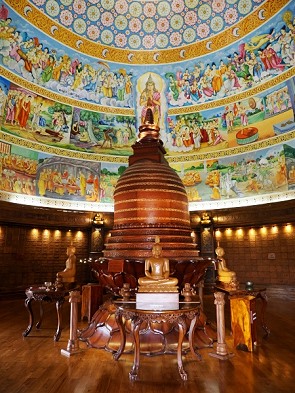 Eine große weiße Stupa erhebt sich elegant inmitten des Klostergeländes und besticht durch ihre klassische Glockenform, die ebenfalls weithin sichtbar ist. Sie besteht aus drei Ebenen. Die unterste Ebene ist der buddhistischen Geschichte Sri Lankas gewidmet. Ein kleines, frei zugängliches Museum, mit so vielen Details, Jahreszahlen und Stammbäumen, dass einem der Kopf schwirrt. Eine zweite Ebene mit Meditationsraum und vor allem die oberste Ebene ist sehr beeindruckend. Das Innere zeichnet sich durch eine schlichte, aber tiefgründige Ästhetik aus, die den Fokus ganz auf die spirituelle Konzentration lenkt.