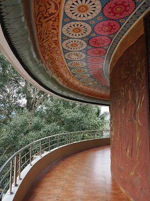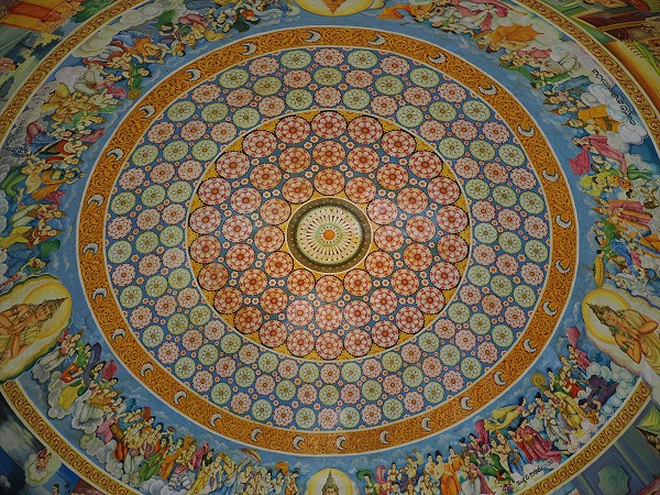 In der Mitte befindet sich eine magische Stupa mit Holzschnitzereien am Sockel und Buddha-Statuen rundum. Die bemalte Decke Decke und die oberen Wände sind Buddha und dem Leben gewidmet, dazu kann man hier kunstvoll geschnitzte Holzkacheln an den Wänden bewundern. Die Buntheit hier war sehr fein ausgearbeitet und strahlte Leichtigkeit und Lebensfreude aus.