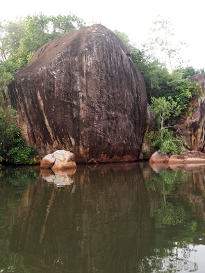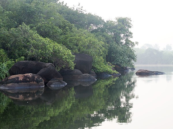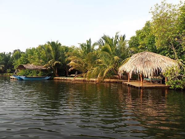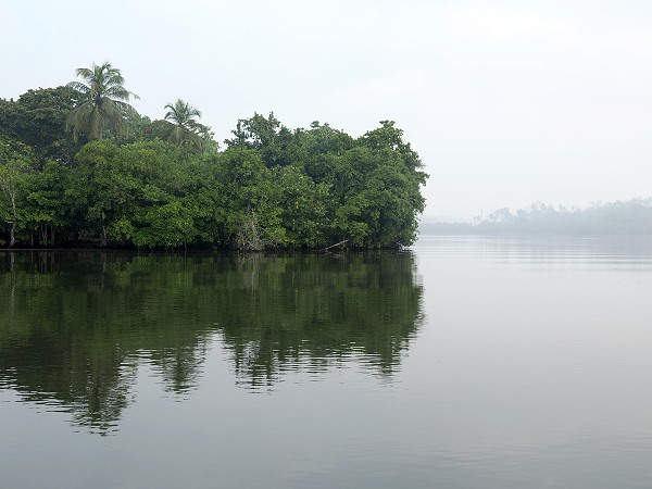 Die Ufer der Lagune sind von dichten Mangrovenwäldern, Zimtpflanzungen und Palmenhainen gesäumt, was ihr eine fast dschungelartige Atmosphäre verleiht. Dazwischen stehen einige Häuser, aber noch war es zu dunkel, um viel zu erkennen.
