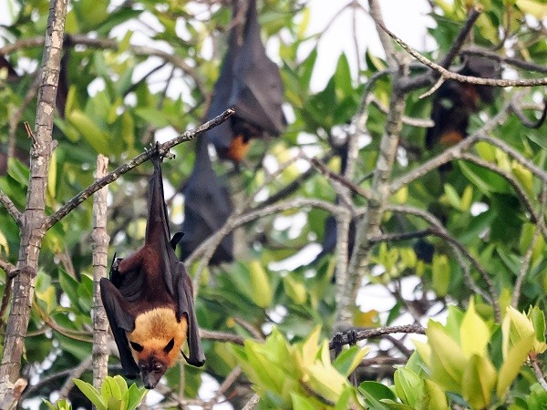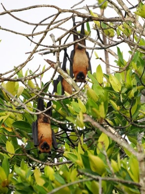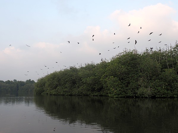 Das Boot gleitet unter die tief hängenden Äste der Mangroven in einen überwucherten Kanal zwischen dem Ufer und einer Bauminsel, und plötzlich wird die Stille von einem fremdartigen, hohen Zirpen und Flattern überlagert. Wir haben eine Insel der Flughunde erreicht. Sobald die beiden Männer das Boot unter den massiven Bäumen zum Stehen bringen, blicken wir nach oben. Da hängen tausende schlafende Indische Riesenflughunde (Pteropus medius) kopfüber an den Ästen, eingewickelt in ihre ledrigen, fast schwarzen Flügel wie in kleine Mäntel.