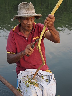 Die Lagune ist ein Paradies für Birdwatcher. Man findet hier Eisvögel, Reiher, Kormorane und den majestätischen Weißbauch-Seeadler. Erste Anlaufstelle war ein Uferbereich, in dessen Bäumen unzählige Reiher, Ibisse, Kormorane und Klaffschnabelstörche übernachten. Sie erwachten gerade, doch leider war es noch etwas zu dunkel für gute Fotos. Die beiden Männer paddelten weiter, nachdem wir es wenigstens versucht hatten, die friedliche Stimmung im Bild festzuhalten.