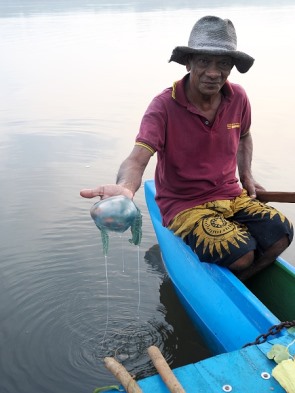 Die beiden Männer fanden auch eine Qualle, die sie geschickt aus dem Wasser fischten, um sie uns stolz zu zeigen. Offensichtlich ohne Nesselfäden. Rundum sprangen immer wieder Fische aus der glatten Wasseroberfläche.