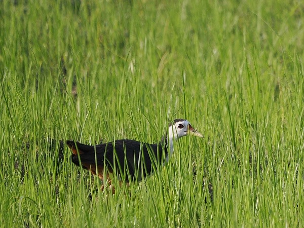 Inmitten der Reisfelder bewegen sich zahlreiche kleine Körnerfresser, die in Schwärmen durch das reifende Getreide ziehen. Mit etwas Geduld lassen sie sich auf den Zäunen und Büschen am Feldrand nieder, so dass wir sie dort gut fotografieren konnten.