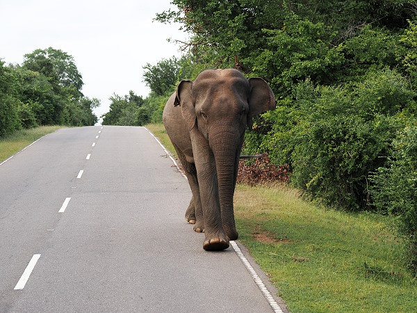 Nachdem wir das Nationalpark-Tor hinter uns gelassen hatten, war die Safari jedoch noch nicht zu Ende. Da es bereits zu dämmern begann, begegneten wir auf der öffentlichen Straße (B35) zwischen Buttala und Kataragama weiteren Elefanten, die sich im schwindenden Licht das Asphaltband als bequemen Weg ausgesucht hatten.