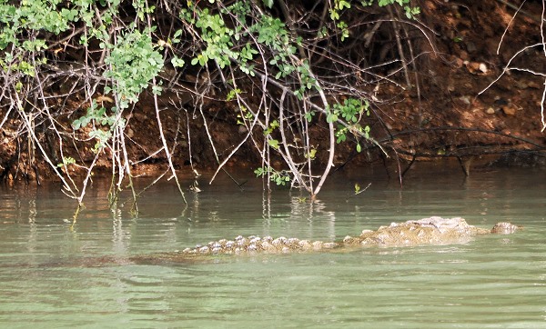 Da es für uns leider keinerlei Sitzgelegenheiten mehr gab, genossen wir unser mitgebrachtes Essen im Stehen, aber nach dem langen Sitzen im Fahrzeug tat es gut, sich ein wenig die Beine zu vertreten. Währenddessen ließen wir den weiten Blick über die glitzernde Wasserfläche und die umliegende grüne Landschaft schweifen. Hier gab es viele Reiher, Störche sowie Adler, und ein Krokodil lag am gegenüberliegenden Ufer auf einer Sandbank. Nach einer Weile brachen die ersten Gäste der anderen Fahrzeuge auf, und wir konnten uns auf die dicken Steine setzen.
