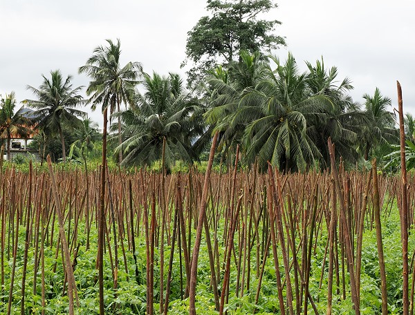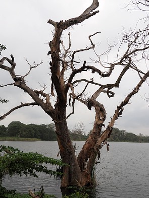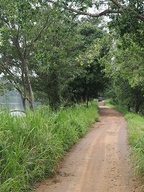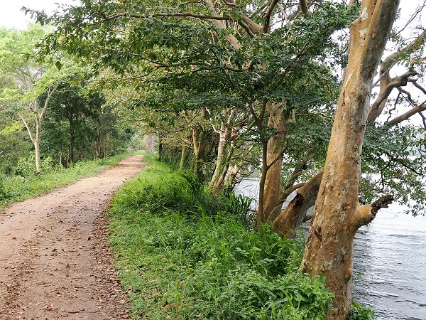 Die Bodenbeschaffenheit wurde besser, sobald man den See erreicht hatte. Hier läuft man auf einem Damm, auf der linken tieferliegenden Seite von Gebüsch und Reisfeldern flankiert, auf der rechten Seite von der Uferzone mit alten Bäumen und Rietgras, in der sich viele Vögel und auch Affen tummeln.