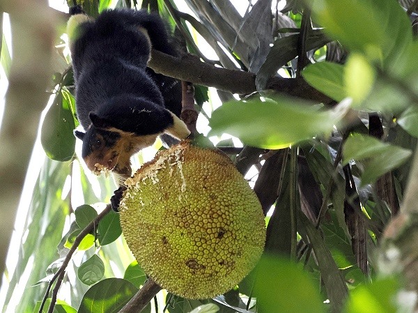 Vorbei an zahlreichen anderen Unterkünften, Neubauten und Teefeldern führt die schmale Landstraße direkt zum Nationalpark-Eingang, wo sie kurz vorher an einen Fußpfad endet. Erst kurz davor konnten wir hoch oben in den Wipfeln ein Riesenhörnchen beobachten, das an einer Jackfruit fraß. Deren gewaltige Größe und buschige Schwänze heben sie deutlich von ihren europäischen Verwandten ab. Währenddessen hallt der melodische Ruf des Goldstirn-Bartvogels durch das Blätterdach, dessen grüne Tarnung ihn fast unsichtbar macht, wäre da nicht der markante goldene Fleck über dem Schnabel.