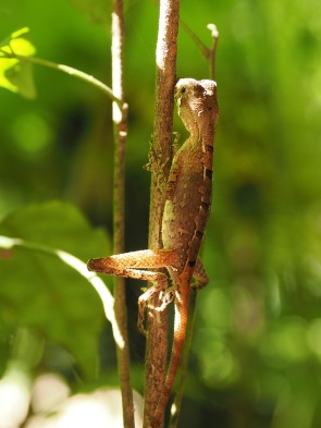 Nach einem Ruhetag, an dem wir bei einem Dorfspaziergang selbst versucht haben, Vögel und Echsen zu entdecken, ging es nach einem guten Frühstück nach dem Auflösen des Morgennebels noch einmal mit Prabath auf Tour. Er nannte es Birding Tour und die war noch einmal um 50 Dollar teurer als die Tour zu 7 Wasserfällen. Dabei war diesmal gar keine Fahrt mit dem Tuk-Tuk nötig, denn der Eingang zum Nationalpark war von der Unterkunft aus zu Fuß zu erreichen. Auf dem Weg dorthin versuchte er, uns so viele Vögel zu zeigen wie es ging. Leider hatte sich das unter den Biestern nicht herumgesprochen, dass wir kamen. So konnten wir noch einmal schön Garten-Agamen bei der Paarung sehen und einige Vögelchen, die wir schon kannten.