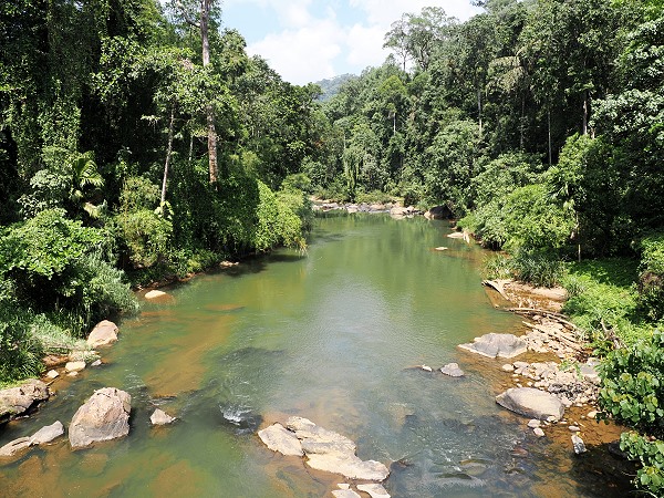Unsere Wanderung durch das Pitadeniya-Gebiet des Sinharaja-Regenwaldes endete mit einem architektonischen und zugleich abenteuerlichen Punkt: dem Überqueren der großen Hängebrücke, die über den Flus Gin Ganga führt. Diese schwingende Konstruktion führt vom dichten, grünen Herz des Nationalparks auf die andere Flusseite in ein Camp. Hier gibt es Unterkünfte, die man mieten kann, allerdings eher für Gruppen oder große Familien. Man findet Bänke und einen kleinen Sandstrand am Flussufer, baden ist dort allerdings verboten.