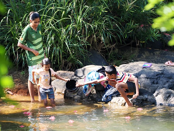 Der Gin Ganga, einer der bedeutendsten Flüsse im Südwesten Sri Lankas, entspringt im Herzen des Weltnaturerbes und schlängelt sich wie eine Lebensader durch das Tal. Ein Weg entlang seiner Ufer führt vorbei an kleinen Siedlungen, in denen das tägliche Leben noch sehr ursprünglich und einfach ist. Man beobachtet Dorfbewohner beim Waschen ihrer Wäsche am Flussufer oder Kinder, die im kühlen Nass spielen, während über ihnen die Kronen riesiger Bambusstauden im Wind schwanken.