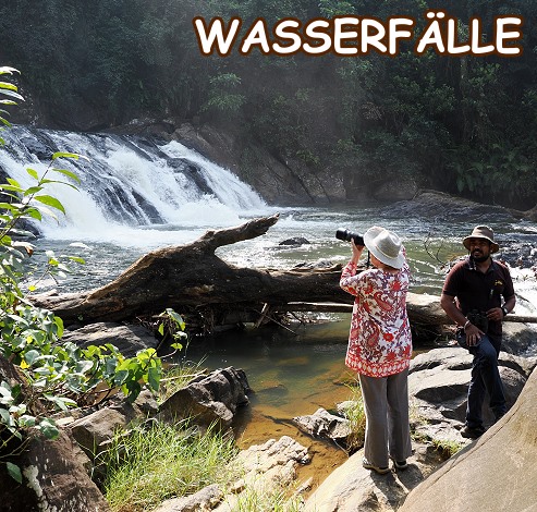 Der erste Wasserfall lag schon auf dem Hinweg und war über viele Stufen bergab in 650 Metern erreicht: der Sathmala Ella Waterfall. Ein netter Platz, an dem wir mit zwei einheimischen Paaren alleine waren. Wahrscheinlich für die örtliche Bevölkering ein romantisches Plätzchen. Wir bobachteten einige Vögel und machten Fotos vom Wasserfall, der gut gefüllt war.