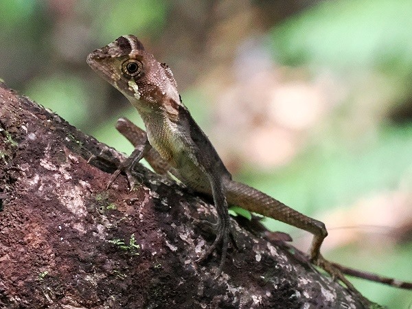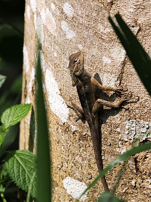 Auf dem Waldboden, oft direkt zwischen den weitverzweigten Wurzeln, huscht die Braungefleckte Känguruechse (Otocryptis wiegmanni) umher. Diese kleine, ebenfalls endemische Agame verdankt ihren Namen der Fähigkeit, sich bei Gefahr auf den Hinterbeinen aufzurichten und mit schnellen Sprüngen im Unterholz zu verschwinden.